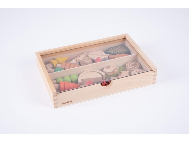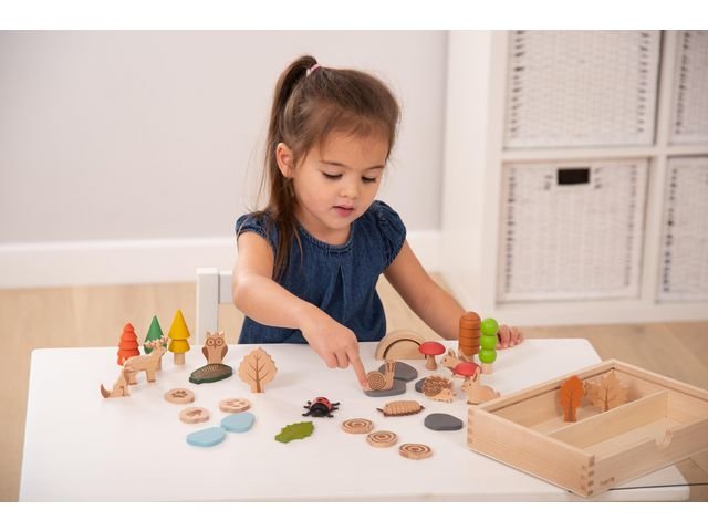Vår vackra nya skogsstiguppsättning inkluderar träd, löv, skogsdjur och småkryp, grå stenar och blå vattenbitar, djurspår med träringsliknande mönster på baksidan, svampar och en 2-delad båge/bro. Djuren, löven och stockarna har laserade detaljer som skapar en lätt fördjupning i träet, vilket ger en taktil sensorisk upplevelse och gör dem även idealiska för kol- eller kritritningar. Spåren tillhör hjorten, räven, kaninen, ugglan, igelkotten och ekorren. Upprättelsen inkluderar 5 x 3D-träd, 5 x 2D-löv med laserade markeringar, 8 x 2D-djur med laserade markeringar (uggla, kanin, hjort, ekorre, räv, igelkott, snigel, fjäril), 2 x 3D-småkryp med detaljer av konstläder (nyckelpiga, gråsugga), 2 x 3D-svampar, 6 x platta stenar och vattenformer, 6 x stockskivor med laserade träringsmönster på ena sidan och laserade djurspår på den andra, en 2-delad bro/båge och en träbox med genomskinligt akryllock. Stödjer följande inlärningsområden: Uttrycksfull konst & Design